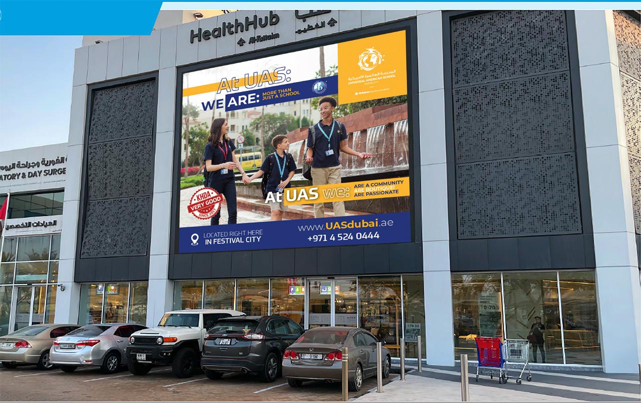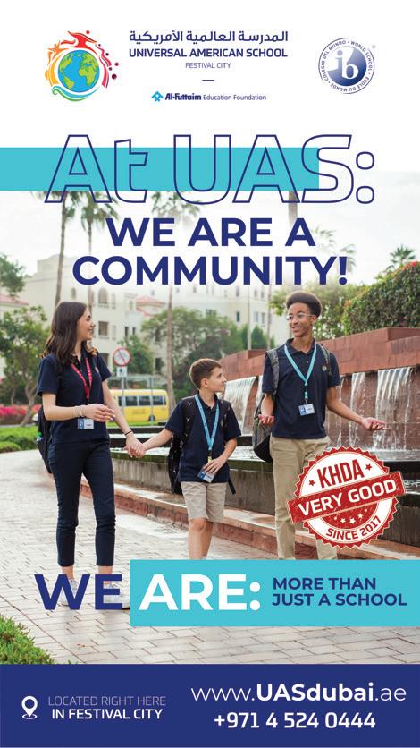 When you step into Universal American School, you will be welcomed by a diverse and inclusive community of caring and curious individuals. Our students are inspired to challenge themselves within a rich academic, artistic, and athletic educational program rooted in the New York State standards and taught through the framework of the International Baccalaureate. Director WORD FROM OUR DIRECTOR ENROL NOW 1200+ STUDENTS exceptional campus 75+ NATIONALITIES EM RATI, TALENT AND ACADEMIC SCHOLARSHIPS AMERICAN CURRICULUM + International Baccalaureate + Advance Placement (AP) RATED VERY GOOD BY KHDA A BOUTIQUE AMERICAN CURRICULUM AND IB WORLD SCHOOL FOREVER DRIVEN BY KNOWLEDGE, INSPIRED BY SUCCESS Universal American School was founded in 2005. Since then we have served our students every day, helping them become compassionate, you learn more about UAS the term “community” will resonate with you family-friendly Festival City. There is a wonderful feeling about our school which comes from our mission: To Nurture an International Community of Integrity and Academic Excellence. A NOT-FOR-PROFIT SCHOOL governed by the Al Futtaim Education Foundation. There are two surplus generated by their school fees will be put back into the school. The second is that working alongside an organization like Al Futtaim, we are uniquely positioned to provide real-world learning experiences to our Universal American School is a wonderful place to grow and learn. Whether you want to participate in our Fringe Festival, one of our four annual school productions, watch one of our 30+ sports teams, debate politics with our Model United Nations students, or learn about our Emirati committee or the National Honor Society, UAS has something to wonderful energy here. CURRICULUM New York State Standards PreK-12 IB Primary Years Programme VERY GOOD 21 - 2022 37 330 40 450 45 850 61 120 63 962 76,670 OUR WORLD CLASS FACILITIES Universal American School is located in the family-friendly Al Badia community at Dubai’s Festival City. 70,000 square meter landscaped campus Expansive science labs Extensive indoor & outdoor covered play areas Medical clinic Media and Design hubs Innovation hub Problem solving and creation Multi-purpose hall 25m swimming pool Information hubResearch and literacy Fully equipped Two large fully equipped art studios Language specialist rooms Natural grass football pitch Multi-sport gymnasium Scorpion Success hub for inclusive education Well-being Centre KHDA has rated the overall quality of education at Universal American School as very good. students to improve their comprehension skills with Numeracy skills are well developed in the KG and elementary school, through a variety of hands-on activities and mental mathematics practice sessions. Students frequently use technology in the classroom to carry out research that helps them enhance their knowledge and understanding of concepts. Students maintain excellent relationships with others because of the caring and nurturing environment of the school. way to graduation with the choice of the American High School Diploma and the IB Diploma Programme. WHAT THE KHDA IS SAYING ABOUT UAS For information on tuition fees, please visit our website. Contact Us: Tel: +971 4 524 0444 Email: info@uasdubai.ae Website: www.uasdubai.ae