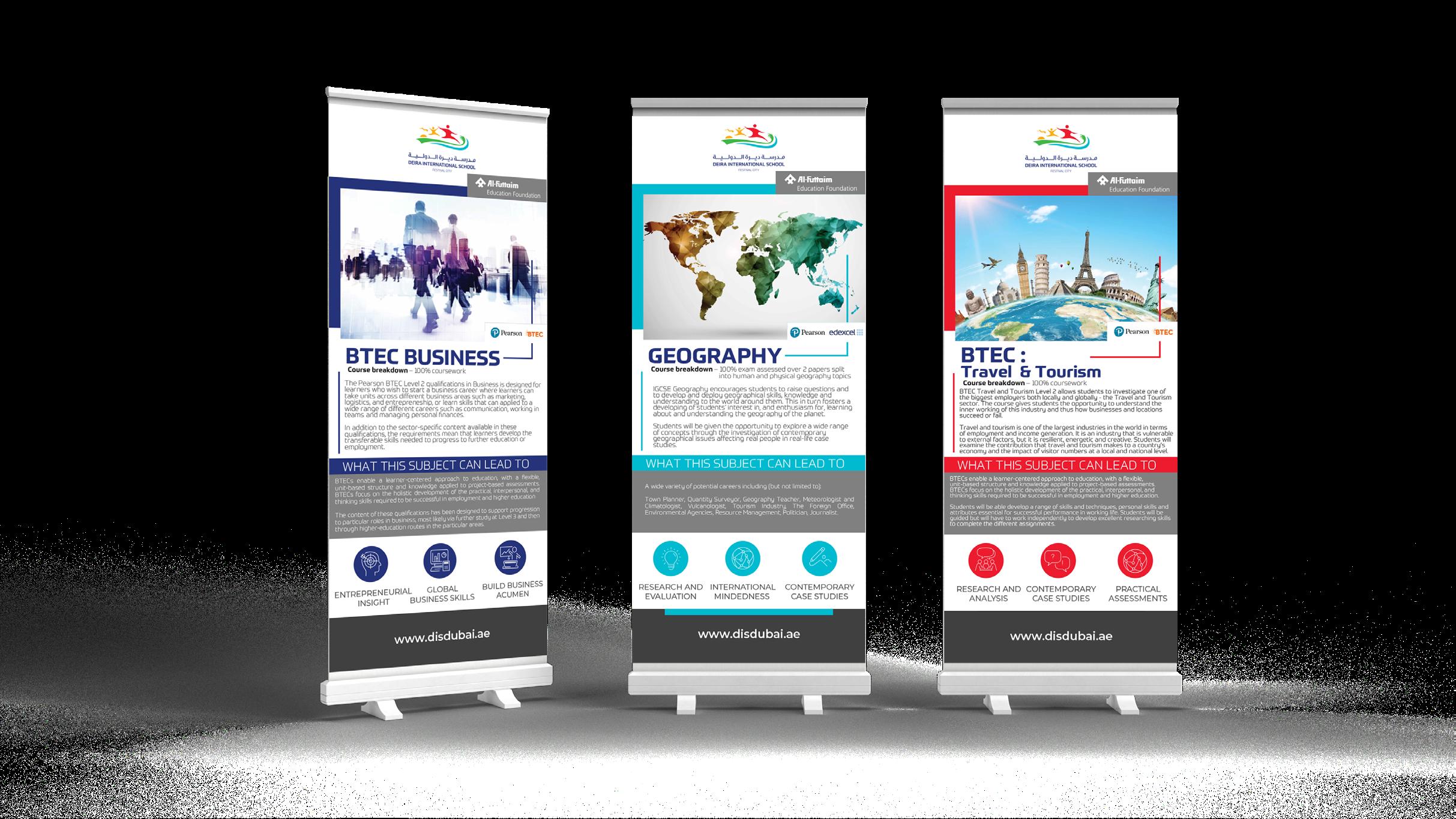 Roll-up banners showcasing the available subject choices for students.