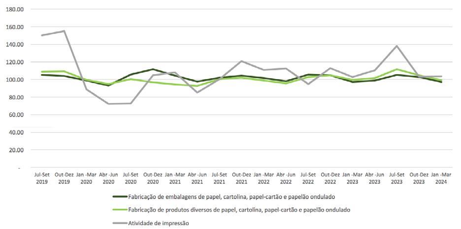 Categoria Mar.23 Dez.23 Mar.24 Mar.24-Dez.23 Variação % Mar.24 - Dez 23 Indústria de M&E Gráficos 84.499 82.013 2.486 3,0% Insumos* 39.165 38.154 1.011 2,6% Indústria de M&E Gráficos** 45.334 43.859 1.475 3,4% Comércio de M&E Gráficos*** 33.983 35.044 -1.061 -3,0% Gráficas rápidas 156.212 142.545 13.667 9,6% Indústria Gráfica 185.816 182.156 3.660 2,0% Embalagens 35.760 36.140 -380 -1,1% Editorial 36.068 34.891 1.177 3,4% Material de segurança: cédulas, talões de cheques e ingressos 8.346 8.424 -78 -0,9% Etiquetas, cadernos, impressos comerciais e publicitários 85.233 84.385 848 1,0% Pré-impressão 10.747 10.534 213 2,0% Acabamentos gráficos 9.662 7.782 1.880 24,2%