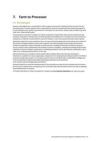 7. Farm to Processor 7.1 Pre-transport Owners or their agents have a responsibility to select, prepare and present for loading only those animals fit for the intended journey. Transport operators have a responsibility to accept for transport only those animals that appear fit for the intended journey. Specific requirements for some species are also found in relevant codes of welfare (e.g. dairy cattle, deer, sheep and beef cattle). The preparation of animals for transport can include consideration of special feed, water and rest requirements and training or acclimation to transport and can involve procedures immediately prior to transport such as the provision of compounds or medicines to assist animals to cope with transport. In some cases physical processes may be required. Appropriate preparation means preparation that is of a type and duration appropriate for the species, the condition of the animals, anticipated weather or other travel conditions, the mode of transport and the history of the animals. Examples of preparation include resting after assembly and prior to loading, familiarisation with particular types or sources of food or water, familiarisation with handling or presence of handlers, emptying out (standing off green feed), treatment to minimise metabolic complications, or husbandry procedures such as shoe removal, covering with a rug or other cover, or placing protective devices on horn tips. Special requirements are provided in species-specific codes of welfare where these have been developed or information is available from industry organisations. Requirements for standing livestock off green feed to limit effluent production during travel are given in the Industry Code of Practice for the Minimisation of Stock Effluent Spillage from Trucks on Roads (by the National Stock Effluent Working Group) which can be found here: www.rcaforum.org.nz/working-groups/stock-effluent Removal of food from animals for extended periods of time (normally more than 24 hours) activates their fat reserves. Animals in poor condition prior to transport (such as cull animals) have lower fat reserves and are less able to withstand food withdrawal prior to transport. For further information on Fitness of Livestock for Transport including Veterinary Declaration visit: www.nzva.org.nz