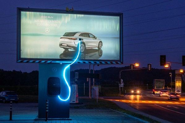 Gemeinsam mit Mercedes hat Epamedia im Rahmen einer Sonderumsetzung ein digitales Posterlight erstmals zu einer voll funktionsfähigen E-Ladestation umgebaut. Das vollständig gebrandete Werbemittel wurde dabei mit einer leuchtenden Kabelinstallation ergänzt, die die kreative Wirkung des Sujets visuell verstärkte.