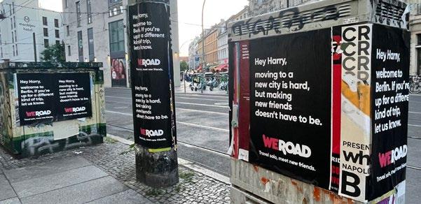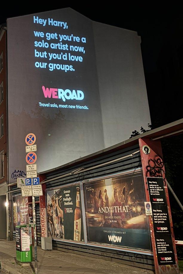 Harry Styles ist in Berlin und versetzt die Hauptstadt in Aufregung – es gibt Star-Sichtungen in Mitte und Moabit, Spekulationen über Berghain-Besuche, Gerüchte und Gerätsel über Zweck und Dauer seines Aufenthalts. Damit sich der Künstler in der neuen Heimat nicht einsam fühlt, hat ihn das Traveltech-Unternehmen WeRoad Ende Mai mit einer Guerilla-Aktion zu Reisen und Events eingeladen. Denn dabei werden bekanntlich gern Freundschaften geschlossen. Plakate, Displays in Berliner Kiosken („Spätis“) und Hausprojektionen machten in den Ortsteilen Mitte, Prenzlauer Berg und Friedrichshain auf sehr persönliche Weise auf das Angebot aufmerksam. „Hey Harry, moving to a new city is hard, but making new friends doesn’t have to be.“, hieß es da aufmunternd, und „Hey Harry, we get you’re a solo artist now, but you’d love our groups.“ Von der Idee bis zur Umsetzung der Aktion dauerte es gerade einmal fünf Tage. „Wir sind am Puls der Zeit und wissen, was unsere Zielgruppe, die Millennials, bewegt. Deshalb greifen wir Aktuelles wie den Aufenthalt von Harry Styles, über den ganz Berlin gerade spricht, spontan und flexibel in unserem Marketing auf“, sagt Helen Eggers, Communication Marketing Manager DACH bei WeRoad.