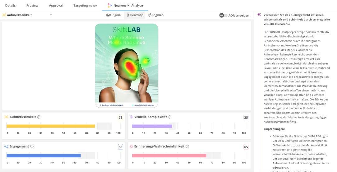 Auch MediaAnalyzer experimentiert mit KI, zuletzt im Bereich Out of Home. Im Februar stellte das Unternehmen das Tool „OOH.brAIns“ vor, mit dem sich Motive im Vorfeld einer Kampagne einem Tauglichkeitstest unterziehen lassen. Dazu wird ein Sprachmodell genutzt, das speziell für die OOH-Branche trainiert wurde und Antworten zu Visual Impact, Markenerkennung, Verständlichkeit der Werbebotschaft und Call to Action abgibt. Der Kunde muss dazu nur das Motiv hochladen und die Zielgruppe auswählen, worauf das System Verbesserungsvorschläge liefert. Gedacht ist die Anwendung für Vermarkter, die einen hohen Durchsatz an Motiven haben und schnell schlüssige Antworten brauchen. Das Tool ersetze nicht die empirische Forschung, betont Egner. Aber es könne eine Vorauswahl treffen und Vergleichsergebnisse liefern. Gerade im Bereich des Pre-Testing tut sich gerade eine Menge. Denn die Kreation hat einen massiven Einfluss auf die Werbewirkung - eine Nielsen-Studie weist Motiven einen Anteil von rund 50 Prozent am ROI zu. Wer vorher testet, hat also einen Hebel zur Optimierung seines Budgets. Dennoch werden – nicht nur bei OOH – zahllose Motive geschaltet und veröffentlicht, ohne zuvor analytisch auf Herz und Nieren überprüft worden zu sein, weil der organisatorische Aufwand gescheut wird. Dirk Held, Mitbegründer von Brainsuite, spricht davon, dass etwa 70 Prozent der Werbemittel ungetestet ausgespielt werden. Dazu kommt eine weitere Entwicklung: Weil die Anzahl der Werbemittel aufgrund der wachsenden Kanalvielfalt steigt, gleichzeitig der Wunsch nach einer personalisierten Ansprache zunimmt, stoßen klassische Pre-Tests an ihre Grenzen. Mit einer entsprechenden Automatisierung könnten Werbetreibende dagegen schnell und kostengünstig ihre Leistung prüfen und damit vermeiden, dass Kampagnen an den geplanten Zielen vorbeikommunizieren, so die Hoffnung vieler Marktteilnehmer.
