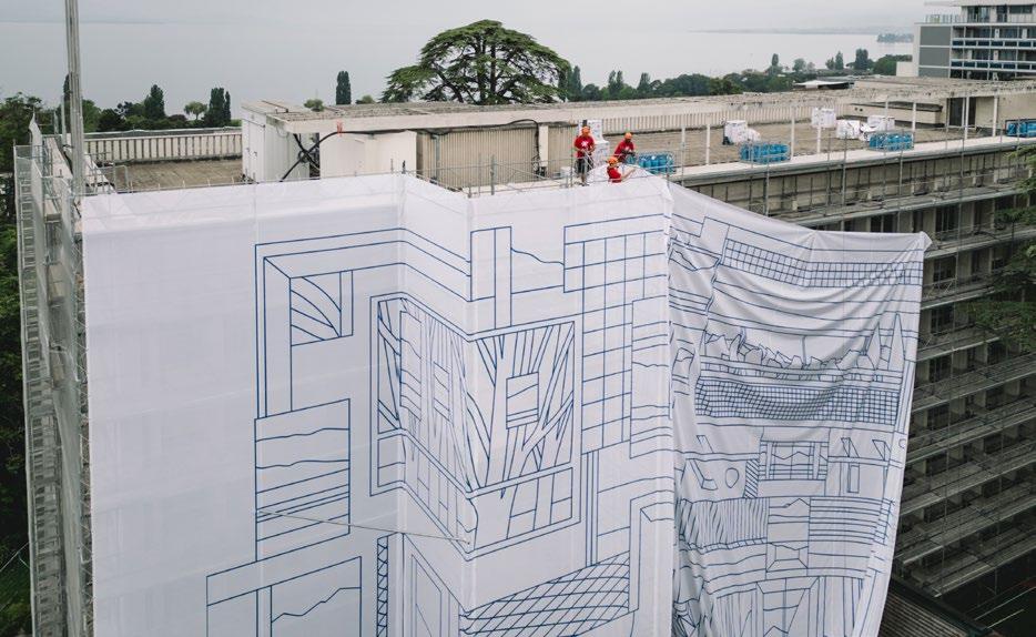 Neue Räume, neue Möglichkeiten Trotz – oder gerade wegen – dieser Herausforderungen nutzt Richnerstutz das Potenzial der Sonderwerbeform. Beispielsweise an ungewöhnlichen Standorten während Umbauphasen. Eine Werbefläche kann heute mehr sein als ein Bildträger – sie kann verschönern, beschatten, nachhaltige Energie erzeugen oder die Aufenthaltsqualität steigern. Zukunftsweisende Stichworte sind solarbetriebene Blachen, modulare Holzelemente für Pop-ups oder diskrete Integration in die Stadtmöblierung. Besonders spannend sind Formate, die sich funktional mit urbanen Themen verbinden – etwa gebrandete Sonnensegel, die an heißen Sommertagen gleichzeitig als Hitzeschutz dienen. Oder Installationen, die Kultur, Kunst und Kommunikation verschmelzen lassen: Die Vaudoise Versicherungen und Richnerstutz haben das Baugerüst des historischen Hauptsitzes der Vaudoise in Lausanne eingekleidet.