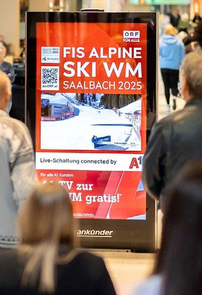 Livestream und Liveticker mit DOOH Wie sich Aussenwerbung vom reinen Werbemedium zur Contentplattform entwickelt, wurde zu Jahresbeginn während der Ski-WM in Saalbach deutlich. Über ein ORF-Signal und mit Unterstützung von A1 waren die Ski-Rennen live auf den digitalen Werbeflächen des Ankünder in der Steiermark und auf den DOOH-Flächen der Partner Gewista in Wien, USP Außenwerbung in Oberösterreich, Progress Salzburg und Progress Vorarlberg sowie PSG PosterService in Kärnten übertragen. Österreichwweit informierten insgesamt 370 Screens über die aktuellen Entwicklungen des Events und brachten die Emotionen des sportlichen Großereignisses in den öffentlichen Raum. Rennläufer, Zwischenzeiten, Gesamtplatzierung ließen sich über einen Liveticker stets mitverfolgen. In den drei größten Einkaufszentren Österreichs war dank Retail Media Screens mit ORF-Live-Bild sogar Zuschauen und Mitfiebern vor Ort möglich.