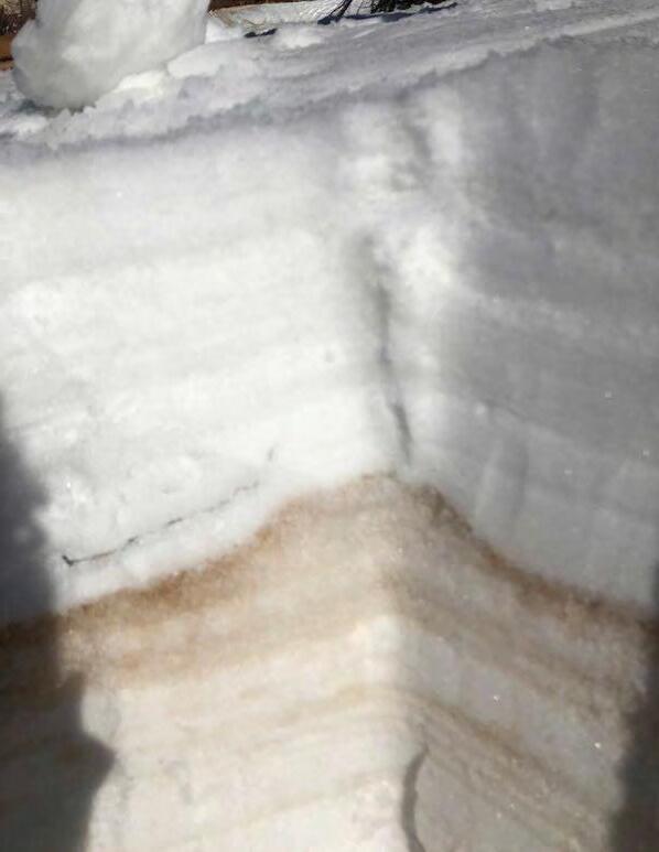 Il s’agit du scénario où le dépôt de poussières est suivi par une exposition de la couche ensablée au soleil. Dans ce cas, il peut y avoir humidification de cette couche, qui n’aurait pas eu lieu en l’absence d’impuretés, puis regel et formation d’une croûte de fusion-regel. Une fois cette couche enfouie sous d’autres couches de neige, selon son épaisseur et les propriétés du reste du manteau neigeux, elle peut le déstabiliser en accélérant le développement d’une couche fragile dans son