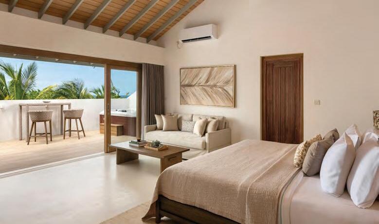 Hermit Suites – Inspired by the local hermit crabs that have made Prāva their home, Uga Prāva boasts two Hermit Suites, featuring ocean views and perfect seclusion for couples, families and solo travellers. Experience tranquillity and elegance in this wellappointed suite, where every detail is designed for relaxation. The Hermit Suites have spacious bathrooms equipped with his and hers vanities along with a walk-in shower, which opens onto a private balcony featuring a jacuzzi.
