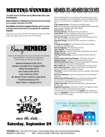 Shop Chamber Members! To take advantage of the following discounts, take along your newsletter as proof of membership or stop by the Chamber office to pick up a card showing you are a current member. Add your company to this list!!! A Plus Printing Services—10% discount on printing & copying. ACN—$100 Visa gift card if we can’t beat current credit card processing rates (thru Anovia Payments, min $3000 monthly sales required) Ad Source One—10% discount. Advance Carpet One—10% discount on any non-sale item. Crown Optical—10% off all eyeglasses, contact lenses, sunglasses & accessories. Not valid with insurance or other discount plans. The E & A CFO Group—One month free payroll or other accounting service with 1 year commitment. Call for free quote. Extra Space Storage—Receive 5% off your monthly rent. Ask Patrick for details. F2 Garage Door Solutions—Free Installation with Purchase of Garage Armour Security Kit ($35.00 value). Fran Ann Engraving—10% off purchase from store. John G’Sell DDS—10% discount off services. Gateway Alarm, Inc.—Receive 3 months free monitoring with a new system. Gateway Tree Care—10% off services. Great Clips-Schnucks Plaza—Haircuts: $10.99, $5 off perms, & 20% off products. Holsome Health Holistic Spa & Boutique—10% discount off services. Infinity Hair Design—15% OFF your first precision haircut or color. Mehlville-Oakville Alumni Assoc—$5 discount (regularly $15) for Alumni by Choice Membership for non-alumni owned businesses Mops in Motion, Inc.—$10 discount on cleaning service of 3 hours or more. Morris Family Chiropractic—Meet the Doctor “Special”: New Patient Free Services: Consultation, Exam & Report of Findings. Office Depot—Use the Chamber discount card for an average 15-30% savings on many items. Park Forest Apartments—Application fee waived and 13 month lease with 1 month free. Pauline’s Place Adult Day Care, LLC—Any enrolled senior family member who is admitted for a year will receive a $10 discount with private pay attendance of 6 or more Monday to Friday hours. Southern Floral Shop—10% discount on each order, or free mylar balloon with a purchase. Ziegenhein Funeral Home—FREE METAL CASKET with "traditional" funeral service for US Veteran or paid pre-need funeral contract If you would like to see your business in this monthly column, simply offer a discount by WRITING OUT the discount and emailing or faxing it to the Chamber office. Your dues must be current.