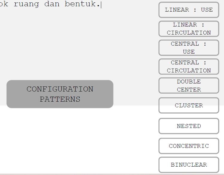 a. Plan to section or elevation (denah hingga potongan) Hubungan antara denah dengan tampak atau potongan, dimana terdapat korelasi yang teridentifikasi melalui konfigurasi horizontal dan vertikal bangunan. Keputusan di satu area (denah) mempengaruhi keputusan di area lain (tampak/potongan).