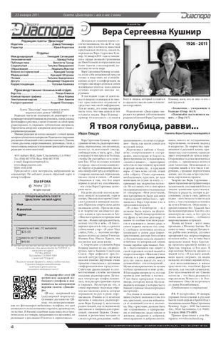 Верстка . . . . . . . . . . . . . . . . . . . . . . . . . . . Роман Климов Компьютерная графика . . . . . . . . . . . . . Илья Коряка Электронная версия . . . . . . . . . . . . . . . . Олег Авилов Распространение . . . . . . . . . . . . . Андрей Пономарь Газета “Диаспора” подготовлена к печати издательским домом “АФИША” Редакция газеты не оплачивает, не рецензирует и не возвращает незатребованные ею рукописи, статьи, письма, фотографии и рисунки, а также оставляет за собой право редактировать и сокращать публикуемые материалы. Перепечатка авторских материалов допускается только с разрешения редакции. Мнение редакции не всегда совпадает с точкой зрения авторов публикуемых материалов. Редакция за содержание рекламных объявлений ответственности не несет. Письма, статьи, рассказы, корреспонденции, проповеди, стихи, а также отзывы, вопросы и пожелания присылайте на адрес редакции по почте или e-mail. 4555 Auburn Blvd., Suite F, Sacramento, CA 95841 Тел. (916) 487-9701 Факс (916) 487-9700 e-mail: diasporanews@mail.ru www.diasporanews.com ISSN 1550-2708 Присылайте свои материалы, набранными на компьютере. Не забудьте указать обратный адрес и номер телефона.