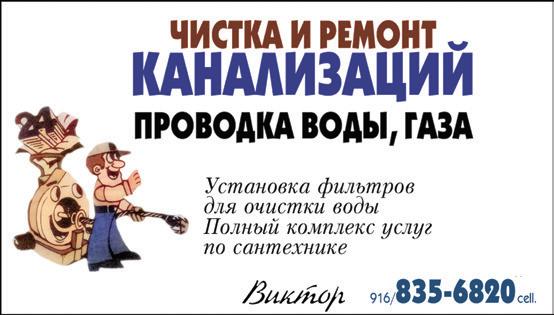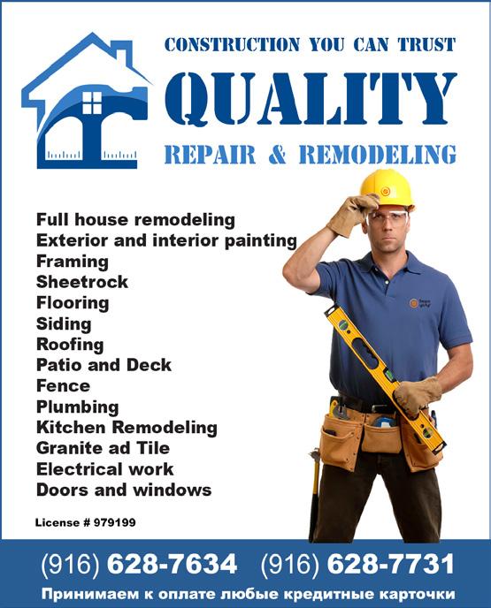 [14] Требуется рабочий по ремонту и строительству, желательно с опытом. Хорошая зарплата. Работа в районе Сакраменто. Тел.: (916) 612-6262.