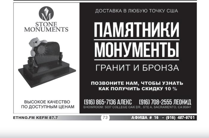 Чтобы поместить объявление в следующий номер, необходимо позвонить по тел.: (916) 487-9701 ext. 1 или www.afisha.us.com