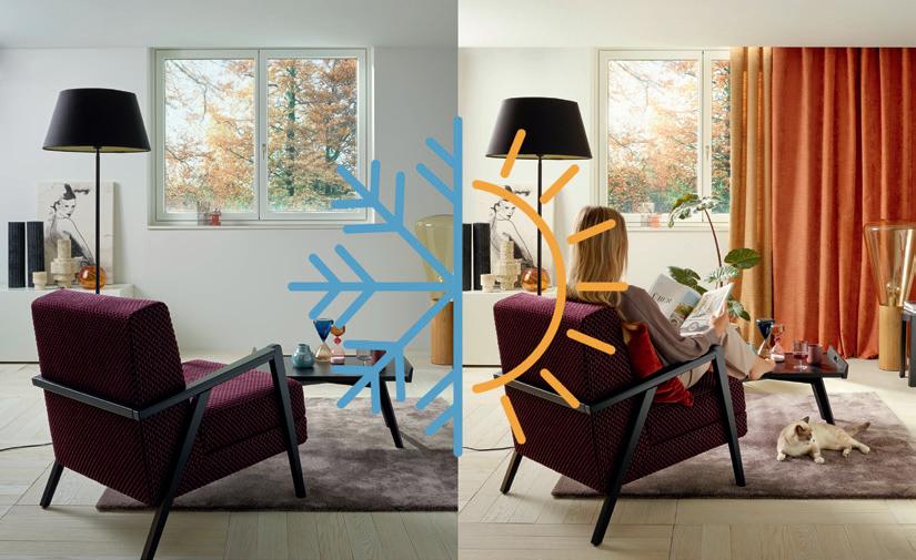 Gerade die Textilbranche bietet hierzu viele Möglich keiten, denn die Art und Weise, wie wir unsere eige nen vier Wände einrichten, nimmt Einfluss auf unseren Energiever brauch. Angefangen bei Teppichböden, die für Wärmegefühl am Boden sorgen, über Dekorationsstoffe am Fenster, die durch den Lufteinschluss wie eine Dämmung wir ken, bis hin zu innenliegendem Sicht- und Sonnenschutz, deren Gewebe – ebenso wie Kälteschutzvorhänge – die Fensterfläche isoliert und so den Austausch von Außen kälte und warmer Innenluft vermindert. Zusätzlich helfen schwere Stoffe vor Ein gangstüren sowie Wandbespannungen aus Textilien.