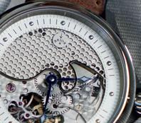Kein Zifferblatt, kein metallener Gehäuseboden stört den faszinierenden Blick in das Innenleben der Mikro mechanik mit seinen technischen Details.