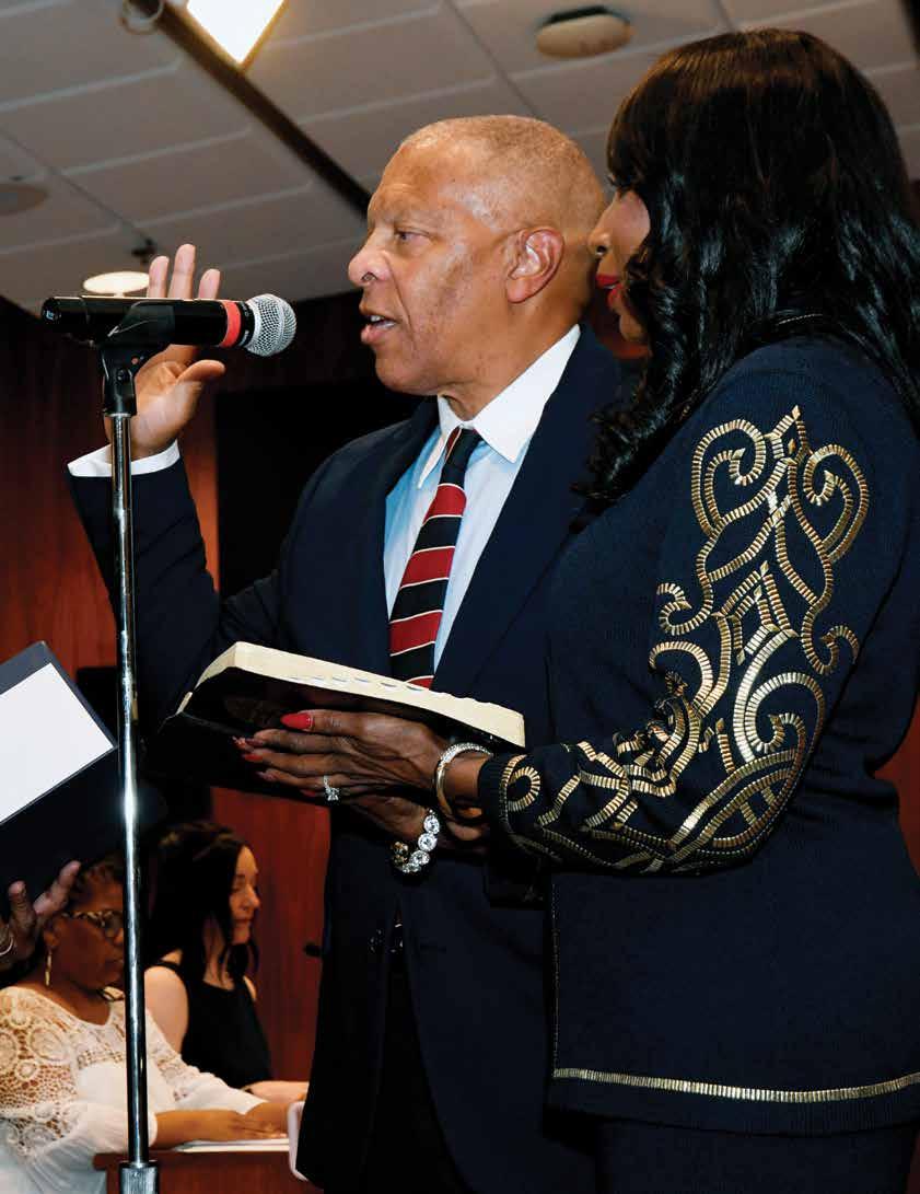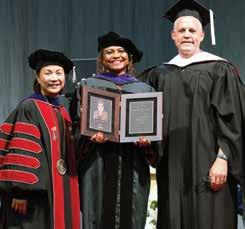PHOTO I L to R: Frank Stalla; Chancellor Joanne Li; Viv Ewing (BS 83, MS 86); Mayor John Ewing (BGS 85, MS 87); Vice Chancellor/Director of Athletics Adrian Dowell; Stephanie (Kirby) Dowell (BS 04); Aileen Warren (BS 83, MSW 85); Thomas Warren (MS 89)