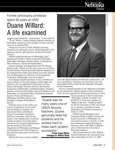 Philosophy, passed away this October, he knew well the value of an examined life. During his 30 years at UNO, Willard's teaching, research, and community service all demonstrated a willingness to ask the right questions and face the honest answers. Willard taught Introduction to Philosophy, Logic, Introduction to Ethics, History of Ancient Philosophy, Philosophy of Religion, Business Ethics, Contemporary Ethical Theories, and Environmental Ethics. Former colleague and department chair Dr. William Blizek recalls, “Duane was for many years one of UNO's favorite teachers. Duane genuinely liked his students and he worked hard to make each student successful. Duane’s love of philosophy was infectious and he passed the excitement of philosophy on to his students.” tor to the larger Omaha and Nebraska communities. He His writings explored questions of value and ethics in was a panelist for “Functions of a Free Press” and “Do areas as diverse as the environment, animal rights and Newsmedia Tell the Truth” for the Nebraska Committee medicine. He was published in the Journal of Value for the Humanities. Inquiry; Philosophy Research Archives; Bicentennial He was a featured speaker for the Nebraska Committee Symposium of Philosophy: Contributed Papers, Dialogue, Business and Professional Ethics; Journal of Medicine and for the Humanities, Omaha Optimist Club and Kiwanis Club. He was a panelist for The Riverfront Forum in 1975. Philosophy; Environmental Ethics; Westminster Institute He was producer of the TV Classroom, Review; Profits and Professions; “Philosophy at Work” for KMTV and Philosophy and Public Affairs; and, KYNE-TV in 1974 and a speaker on Dialogue: Canadian Philosophical “Rights in the ’80s -- Religious Rights” Review. for the TV Classroom in 1982. He served Willard’s service to the UNO comon an advisory committee on drug munity included time on the UNO dependency for Omaha Awareness in Animal Welfare Committee, the Action in 1974. Educational Policy and Honors Willard earned AB degrees from Program Committees, the Dean's Tennessee Temple College in Voice and Advisory Committee, UNO Faculty Baylor University in Philosophy. He Senate, UNO Adjudicatory Committee received his master’s in divinity in 1961 and the Academic Vice-Chancellor's from Midwestern Baptist Theological Task Force on University Requirements. Seminary and an MS (ABD) in philosoHe also served as chair of the phy in 1964 from the University of Department of Philosophy and Religion Wisconsin-Madison. and President of the UNO Chapter of After his retirement in 1993, Willard the American Association of University F o rm er D u an e W i l l a rd moved to Branson, Mo. He passed away Professors. Coll eague Dr. W ill i a m B l i z ek after a long illness on Oct. 11, 2007. Willard also was an active contribu-