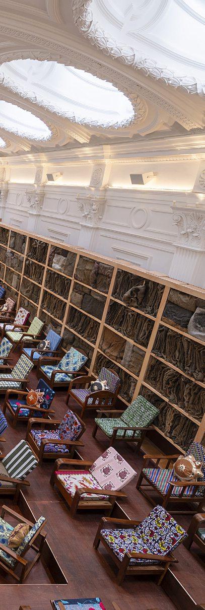 FONDÉE PA R LINA LA ZA AR, critique d’art et commissaire d’exposition tunisienne, dans le cadre de la Fondation Kamel Lazaar – qui produit et soutient des initiatives et des projets artistiques et culturels dans toute la région MENA (Middle Ea st and North Af rica) –, Ibraaz a débuté, en 2011, comme une plate-forme en ligne dédiée aux scènes de tous ces pays. Installée depuis peu dans un bâtiment londonien classé, son extension physique, quelque 10 000 m2 et six étages, propose des espaces mis au serv ice des arts, de la culture et des idées. Pour son ouverture, l’artiste ghanéen Ibrahim Mahama a transformé l’une des grandes salles avec Parliament of Ghosts, une installation construite à partir de meubles de l’époque coloniale et de sacs de jute collectés pendant la période du Covid. Figure incontournable de l’art contemporain, reconnu pour ses installations monumentales, l’artiste nous confronte aux dispositifs de mondialisation historiques et contemporains. Ibraaz, qui signifie « éclairer » en arabe, se veut avant tout un lieu de découverte gratuit, où des communautés venues de tous les horizons peuvent se rencontrer et échanger Au niveau de la rue, la librairie Maktaba et le café Oula invitent la ville à entrer La salle de réunion Majlis accueille des expositions et des débats ; Minassa, au rez-de-chaussée, organise des projections et des spectacles ; et Iqra, la bibliothèque, offre un espace de réflexion et de lecture. Un site protéiforme, où l’écoute et la prise de risques forgent de nouvelles solidarités. ■ Catherine Faye