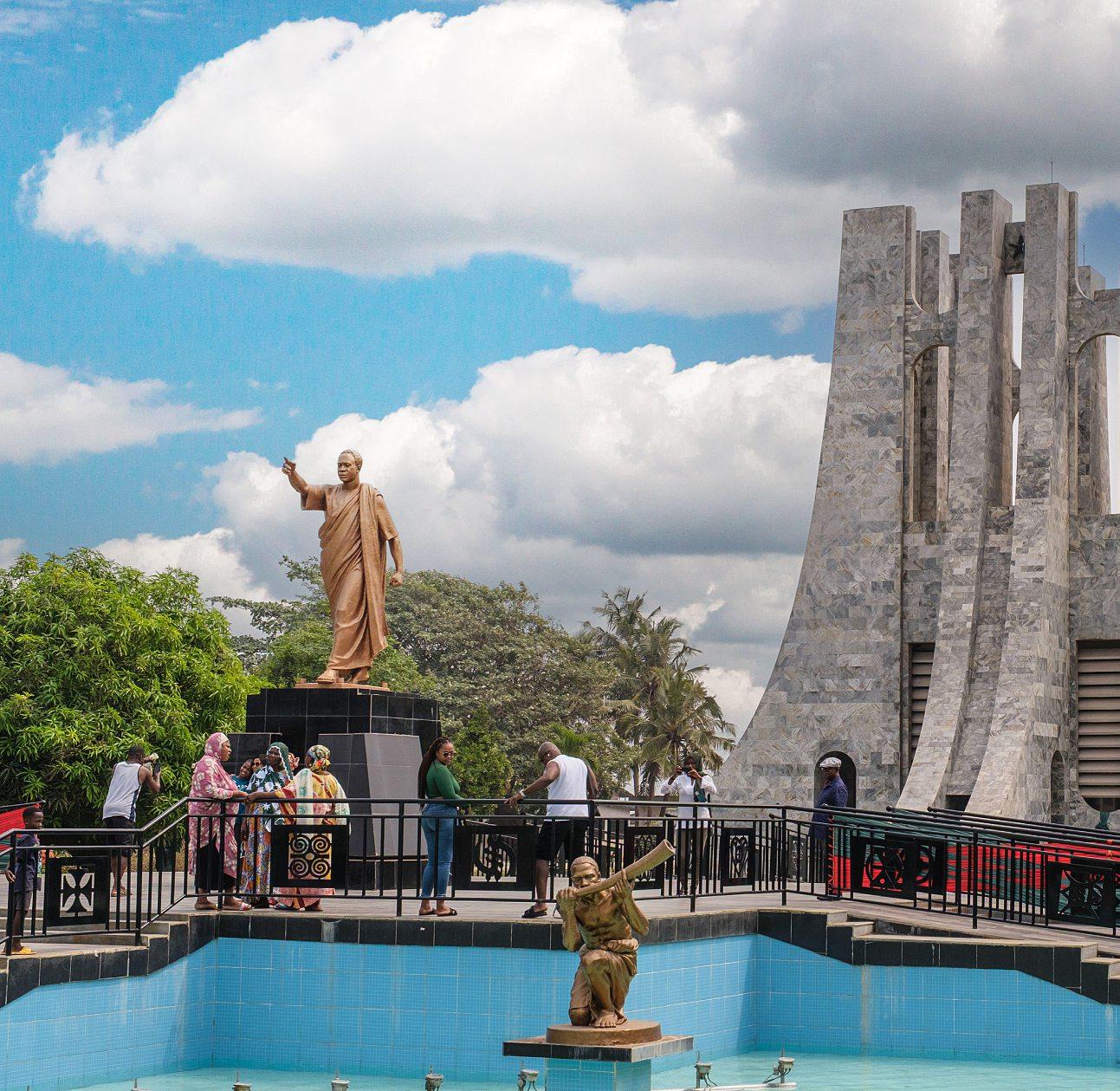 Ci -c ontre, le ma us ol ée de Kwam e Nkru ma h. Ci -d es su s, de s pa rt ic ip ants du fe st ival Af ro ch el la , re ba pt is é Af rofu tu re