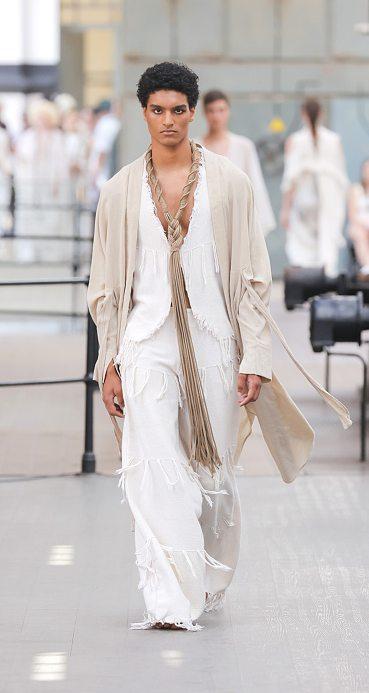 sensorielles immersives qui puisent dans le fantastique et les traditions pour proposer des vêtements sobres et chics. Ils racontent des histoires zimbabwéennes contemporaines, subtilement imprégnées de patrimoine et de nuances culturelles. Comme sa dernière ligne en date, «Ngano» (contes fantastiques ou folkloriques shona), où les silhouettes fluides et minimalistes, les robes et les tailleurs vaporeux, font des répétitions intentionnelles et poétiques leur force discrète Chaque pièce célèbre la beauté complexe du devenir, rappelant qu’aucune histoire n’est jamais ni unique ni figée. Madondo se laisse guider par l’intuition lors du processus créatif, mais sa réflexion sur les matériaux et les techniques la conduit à privilégier les fibres naturelles, comme le coton et le lin cultivés au Zimbabwe. Fidèle aux principes de l’économie circulaire, elle a d’abord travaillé à partir de stocks invendus. Aujourd’hui, elle transforme même les chutes de tissu en détails qui donnent à ses créations des textures riches et captivantes. hausofstone.online ■ L.N.