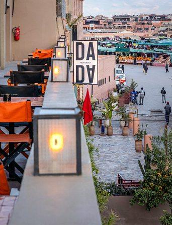 ALORS QUE LA CÉLÈBRE PLACE Jemaa el-Fna change de visage et se prépare à une réouverture au public après des mois de travaux, la vieille ville évolue aussi. Près de l’esplanade a récemment poussé un lieu insolite et inattendu. Dada est un hub culturel et gastronomique qui est venu occuper l’enceinte de l’ancienne gare routière: un bâtiment moderniste de 4000 m2 qui avait été morcelé et découpé au fil du temps pour créer des volumes disparates anonymes et indépendants «Nous avons entièrement retracé la déambulation pour relier entre eux tous ces espaces déconnectés», explique l’architecte d’intérieur Anne Favier Forte de sa connaissance du Maroc, où elle travaille depuis plus de vingt ans, elle a employé des matériaux simples et caractéristiques, comme le zellige et le tadelakt, ou intemporels, comme les miroirs et le béton, pour façonner les lieux. Si l’on peut circuler librement entre la galerie d’art contemporain, la cafétéria, la librairie, le restaurant et son rooftop, le salon lounge arboré avec sa petite cour, le club dancing, ou encore l’espace de projection évolutif, chaque lieu a une personnalité bien définie à travers la déco sur-mesure et la couleur qui le caractérisent. Élément de rappel et hommage à la place Jemaa el-Fna, l’orange (la couleur et le fruit) pointe son nez çà et là, depuis la façade principale en béton, avec ses grandes assises rondes et emblématiques, jusqu’au mobilier et aux zelliges @dadamarrakech ■ Luisa Nannipieri