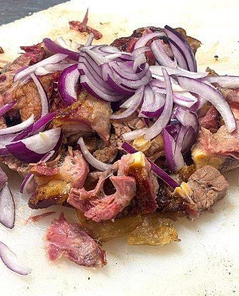 Saba Traoré et son fameux dibi d’agneau accompagné d’oignons rouges.