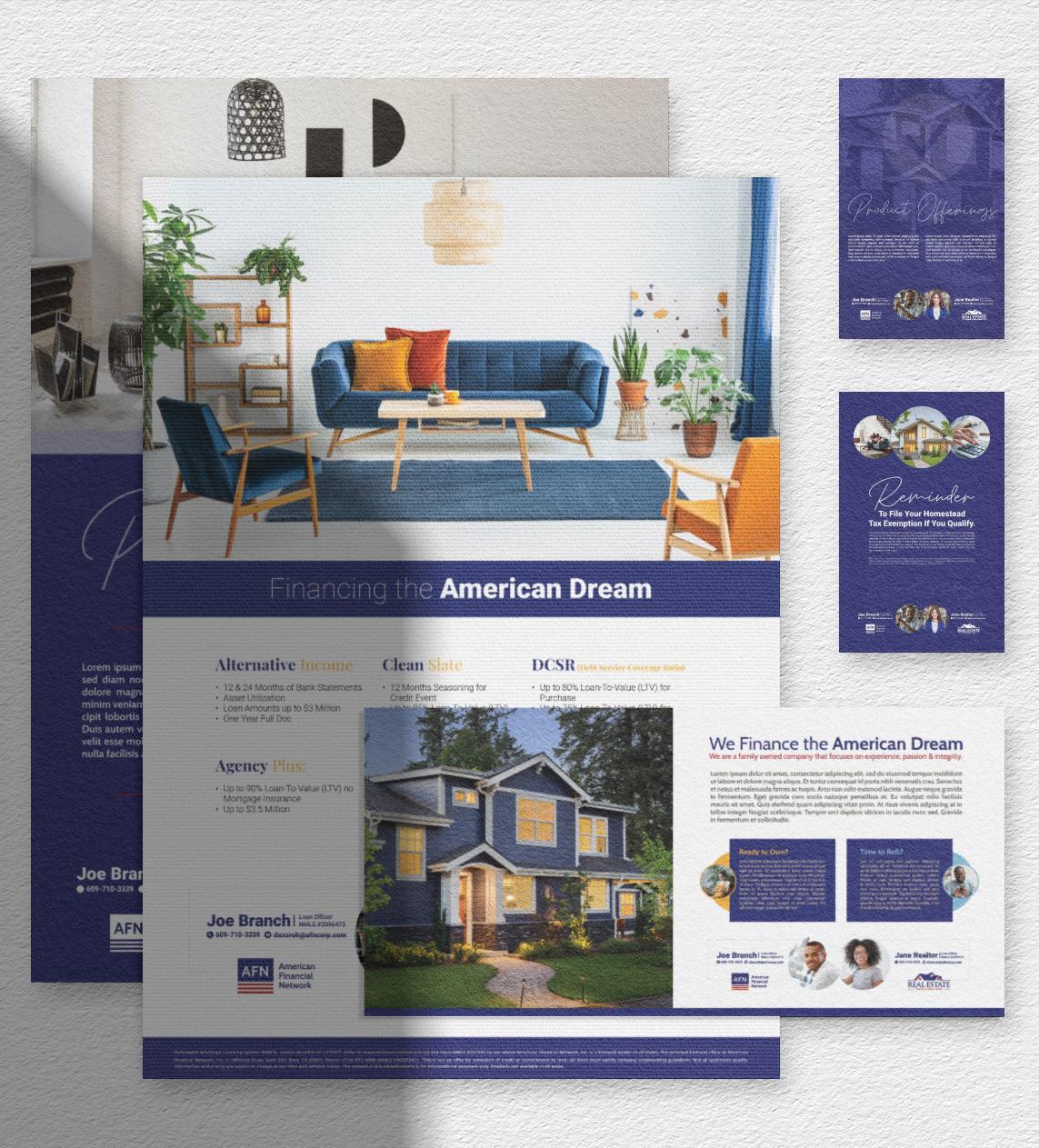With a marketing library that features 1,000+ pieces, from multi-media campaigns to direct-mail postcards, AFN’s marketing library is much more than just flyers. From brochures and postcards to open house flyer support*, our marketing team creates custom materials that are co-branded and compliance approved to suit the individual needs of you and your customers.