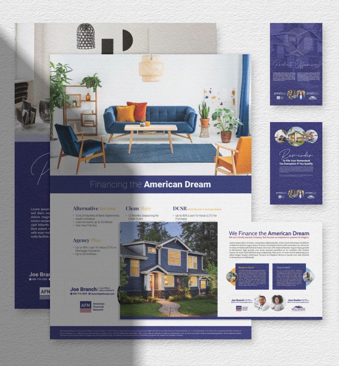 With a marketing library that features 1,000+ pieces, from multi-media campaigns to direct-mail postcards, AFN’s marketing library is much more than just flyers. From brochures and postcards to open house flyer support*, our marketing team creates custom materials that are co-branded and compliance approved to suit the individual needs of you and your customers.
