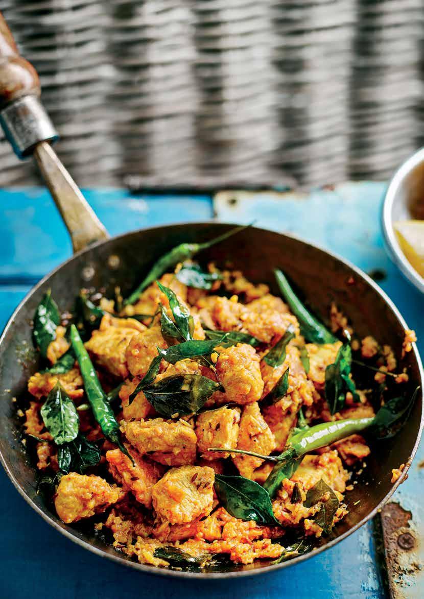 This has a fair amount of heat, but the flavour is so good and the chicken so soft that you can’t stop eating! My mother’s friend used to make something similar with chicken on the bone and I just couldn’t stop eating even as it made me sniff and tear up; it was that good. No one knows why it is called chicken 65, as the origins of the recipe are really blurry, but it is a well-known and much loved dish in Andhra. There are a couple of versions – one with a sweet chilli sauce added to it and others with a vibrant red food colour. I leave both out, but sometimes add some Kashmiri chilli powder to the marinade, which has a lovely colour but only mild heat.