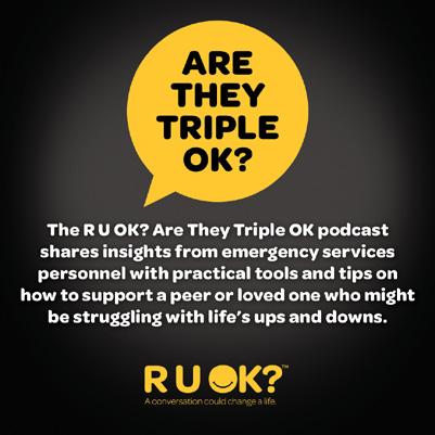 “My advice to the emergency services community is to learn how to have an R U OK? Conversation and start having them,” he said. “If someone is struggling, reaching out for help can feel like a heavy thing to do, it can be a hard task and it can feel overwhelming. But when you take the time to ask someone how they’re travelling,youcantakesomeoftheweight off and some of the burden away. People are often relieved to have a conversation and feel that level of camaraderie.”