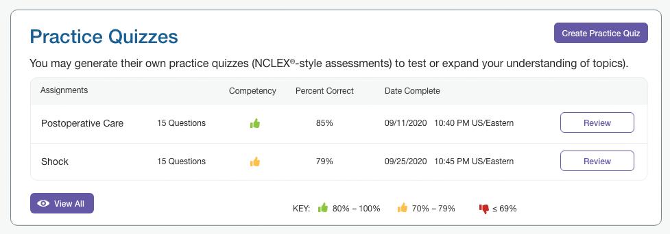 Quizzing uses NCLEX®-style Q&A to provide the additional practice students need to master must-know content and improve their scores on classroom and certification exams. The questions cover the same topics and concepts as the textbook and align with Personalized Learning and Clinical Judgment to provide another way to assess how well students understand the course material.