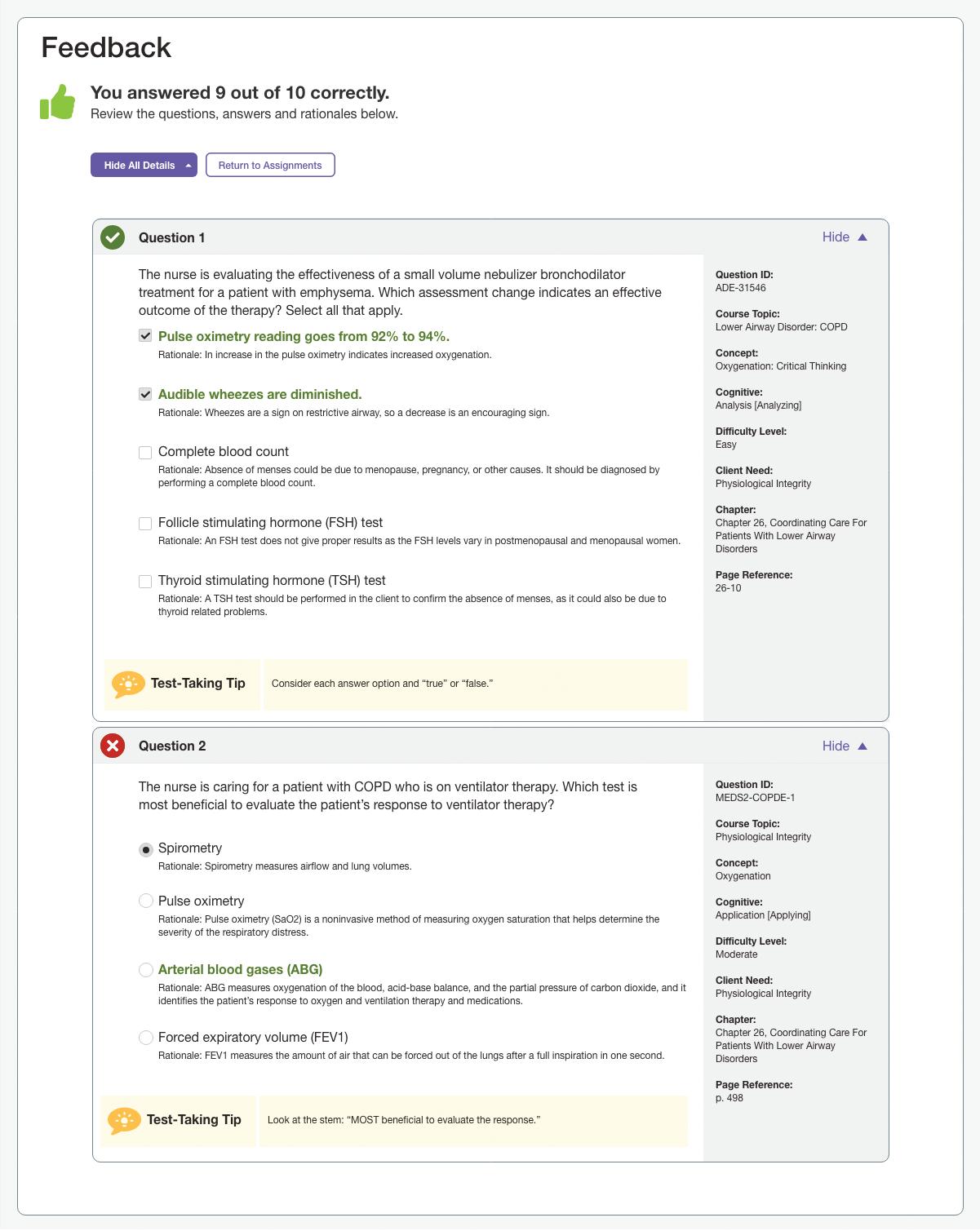 Comprehensive rationales provide students with immediate feedback for on-the-spot remediation that explains why their responses are correct or incorrect. Page-specific references direct them to relevant content in their text, while Test-Taking Tips improve exam skills.