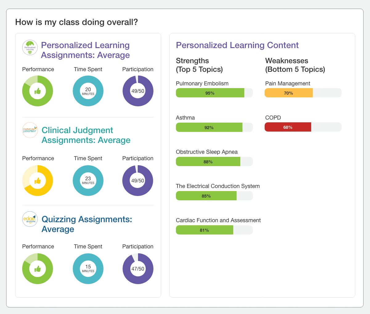 Students’ Personalized Learning Plans monitor their performance on each Personalized Learning, Clinical Judgment, and Quizzing assignment to highlight areas of strength and weakness.