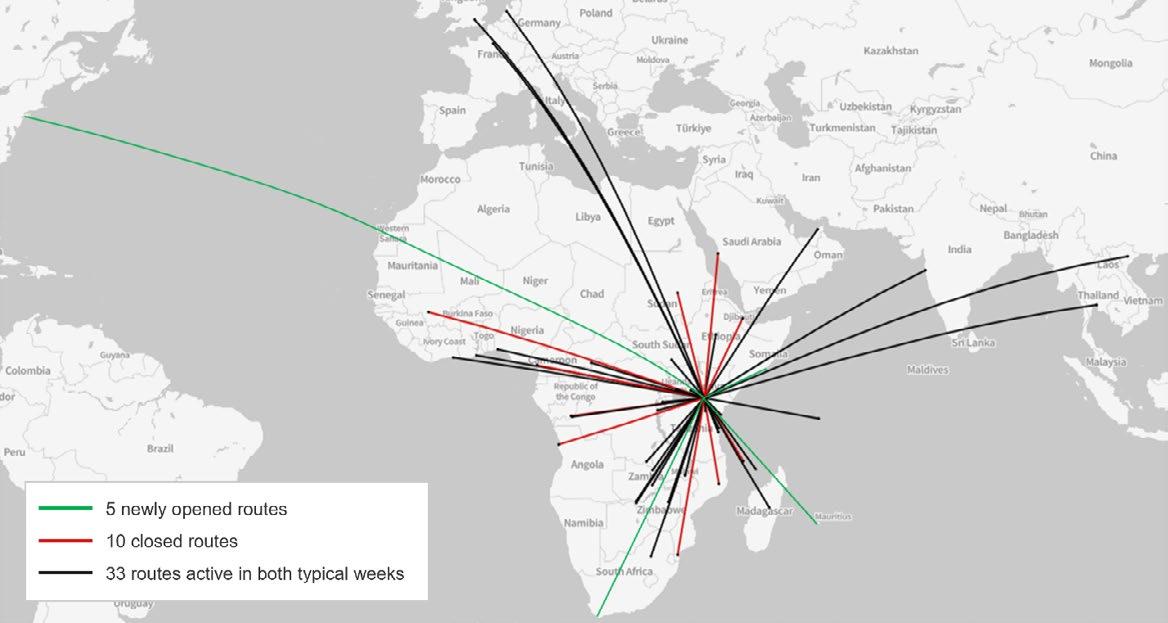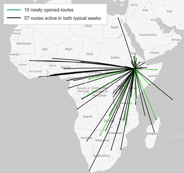 2: Ethiopian Airlines’ direct continental passenger routes from Addis Ababa (ADD) (typical week in June, 2017 vs. 2024) Source: OAG Mapper