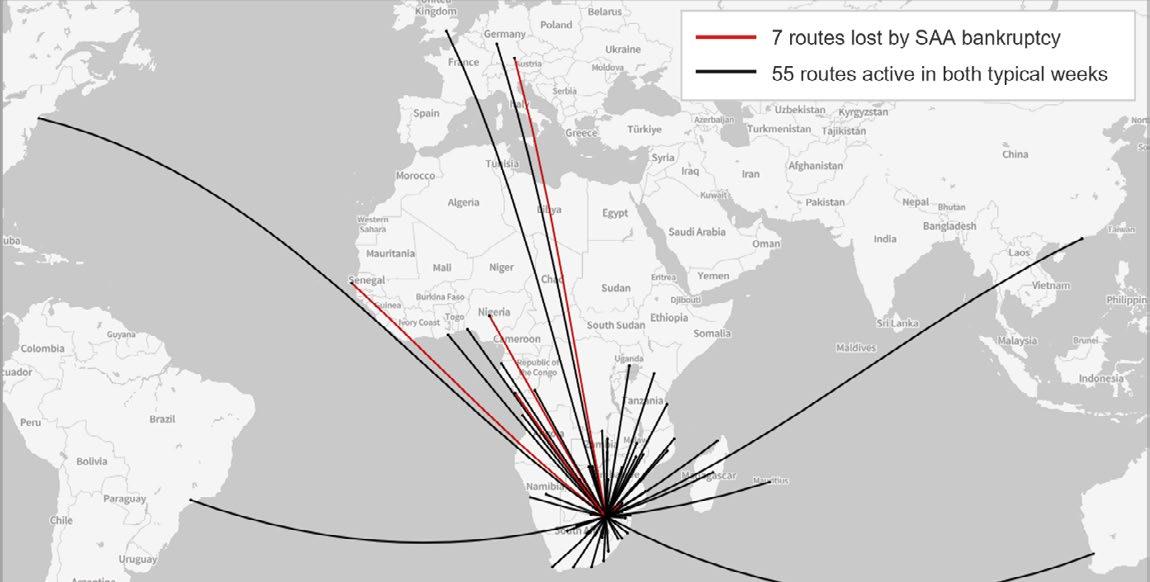 Figure 6: SAA network from Johannesburg (JNB) in 2017, highlighting routes lost due to SAA’s collapse in 2024 (typical week in June)