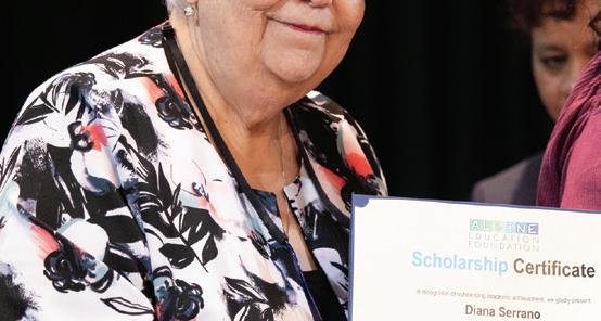 Rose Avalos, miembro de la junta directiva de Aldine ISD, y Rose Avalos, miembro de la junta directiva de la Fundación Educativa Aldine, le presentan a Diana Serrano, estudiante de Aldine ISD, su beca AEF.