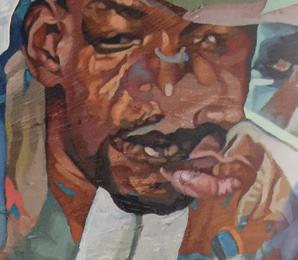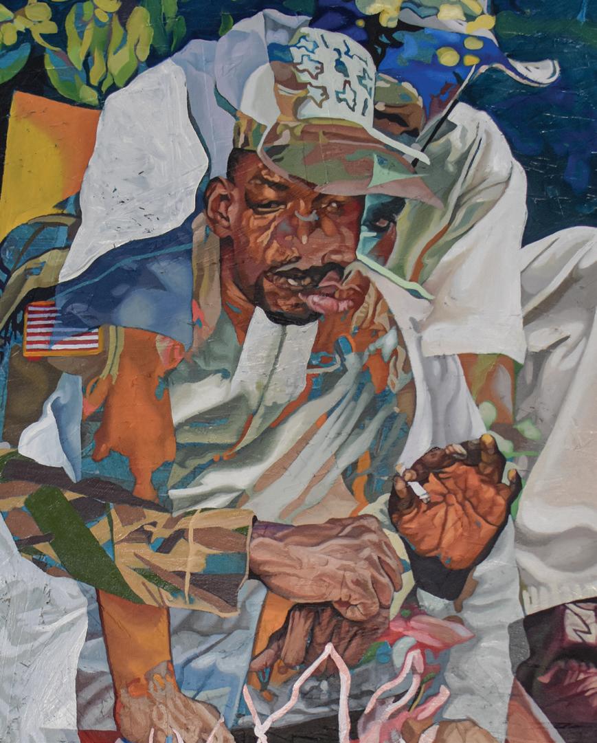 mud cloth from Mali, paper cutouts of visible and partially visible faces, Congolese bark cloth, neon lace, gestural lines, and splashes of color on single frames and triptychs. From permutations of the song from a civil rights march in “Ain’t Gonna Let Nobody Turn Me Around,” to migration in “Take the Long Way Home,” and maps of a rainforest in “Ituri Forest”, Simmons has produced work that re ects his inner life and receptive mien.