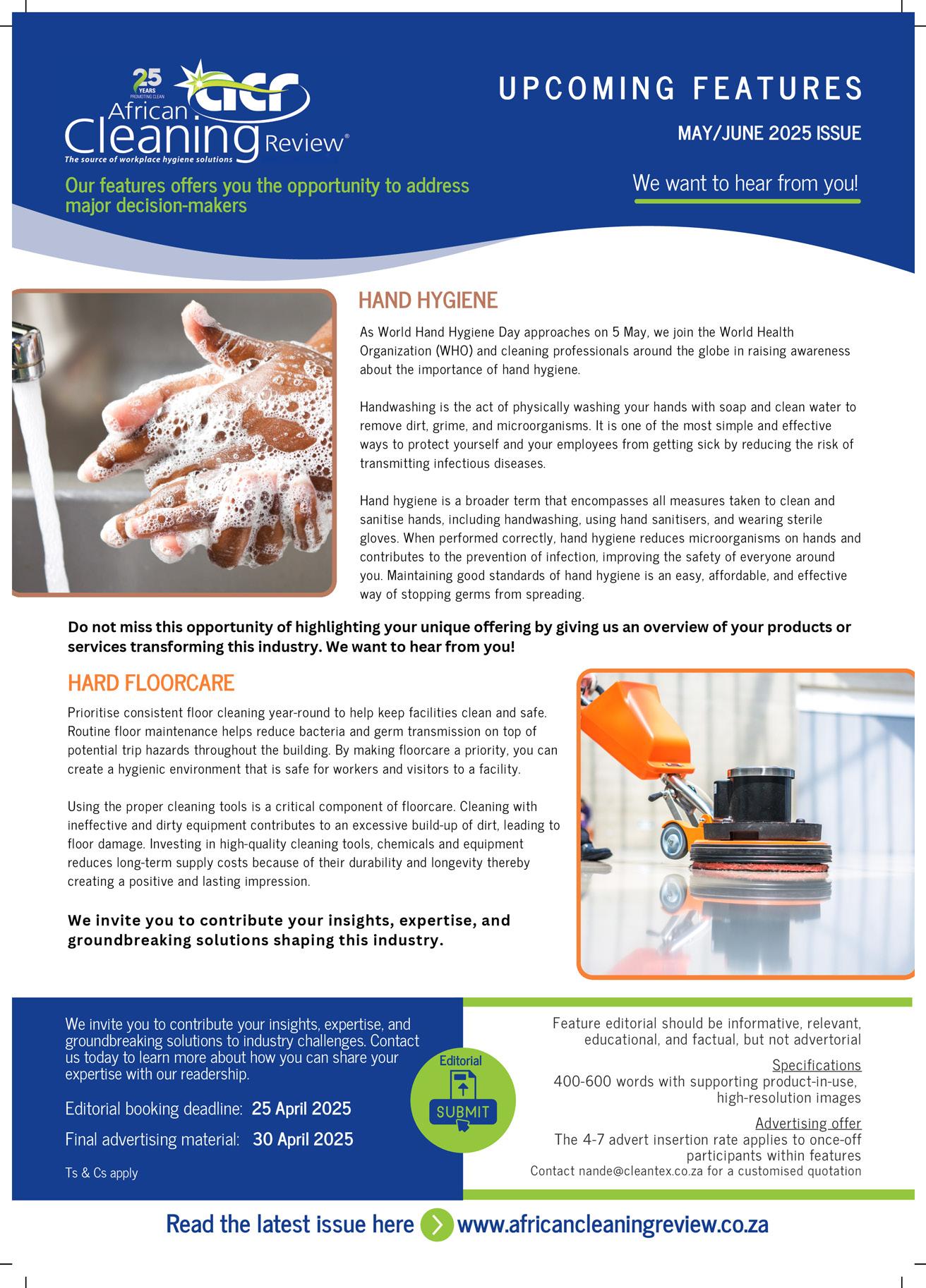 Then, the Cleantex Executive Summit will take place in Cape Town on 4 September 2025. This is the premier African event for cleaning professionals and limited seats are available. This business-to-business summit and niche expo brings together the top cleaning professionals in Africa for a day of knowledge transfer and networking with forward thinking industry professionals. Remember, the previous events sold out, therefore, ensure your seat at this high-level event is secured. The outside back cover of this issue offers more details.
