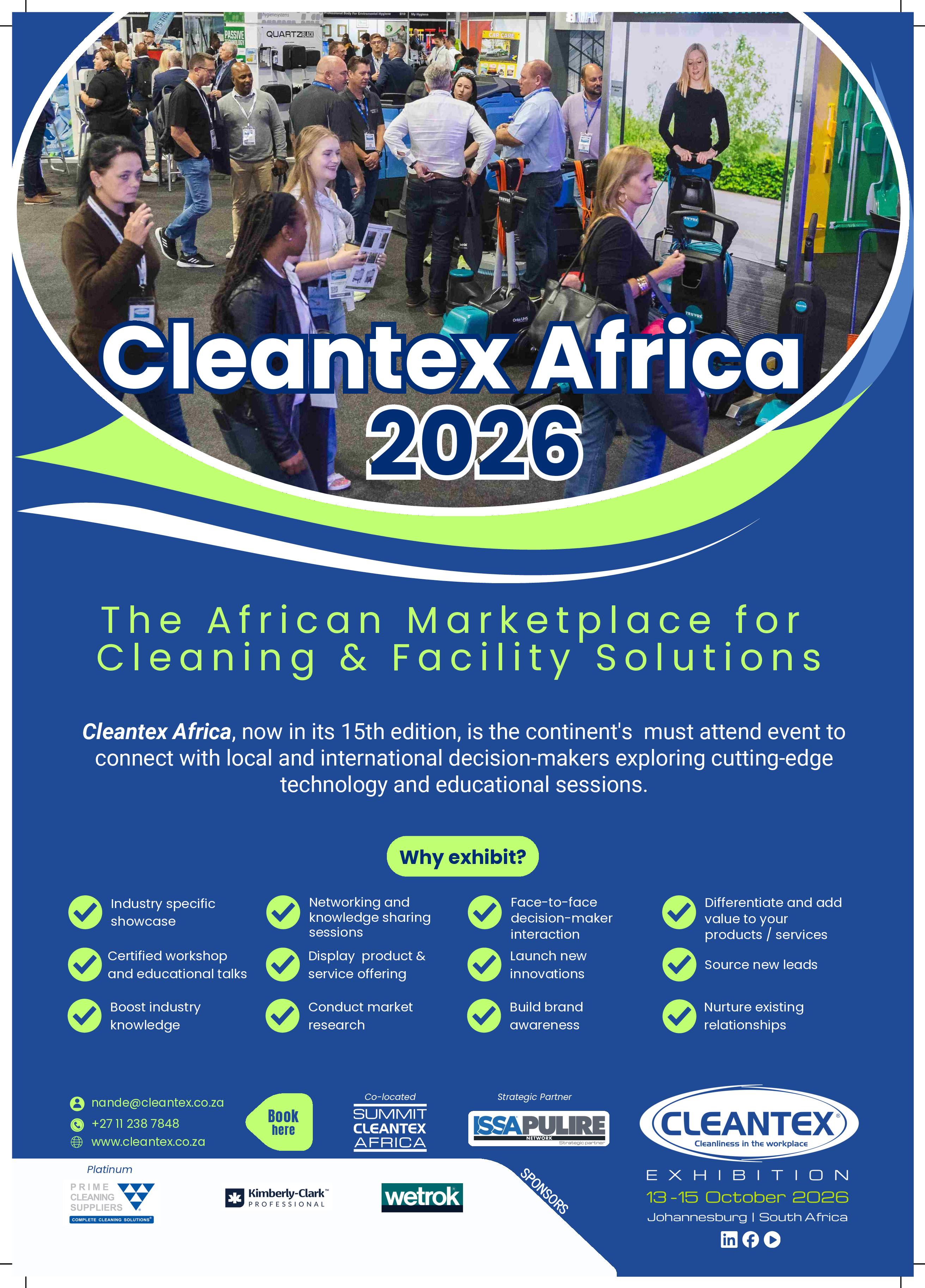 EMAIL: africancleaningreview@cleantex.co.za in order to secure your copy entry in the African Cleaning Review 2026 Buyer’s Guide edition. Once-off charge: R585 excl. VAT for 365 days.