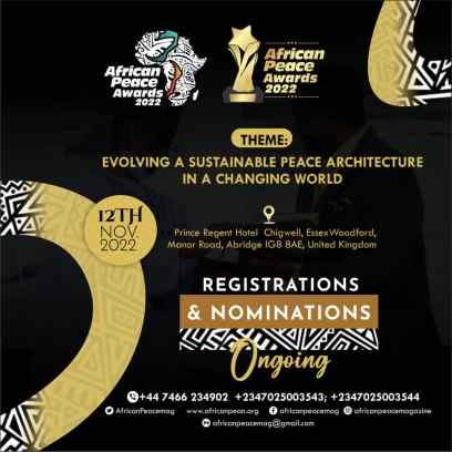 The African Peace awards 2022 seeks to honor persons, institutions, organization, governments and others whose laudible actions, and efforts have in one way or the other improved or contributed to peace keeping and conflict management in Africa as wellas improving the lives ofAfricans.