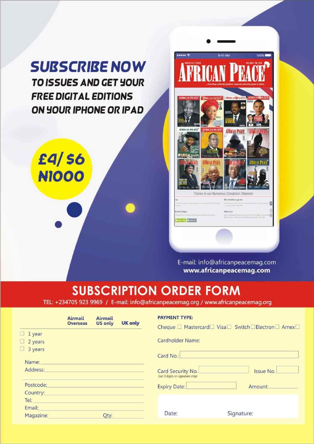 52 10/$12 N5000 Email: africanpeacemag@gmail.com www.africanpeace.org SUBSCRIPTION ORDER FORM TEL: +44 7466 234902; +234 803 397 5746 / Email: africanpeacemag@gmail.com / www.africanpeace.org