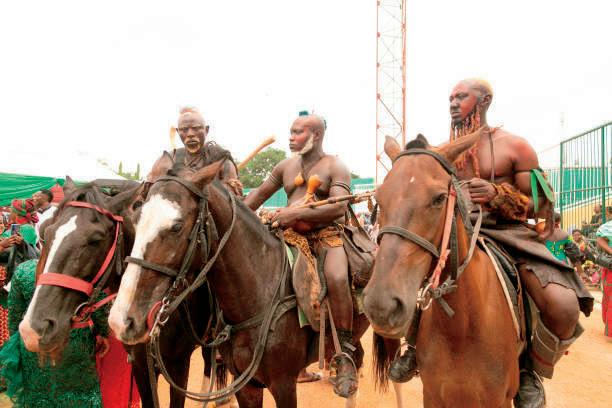 The final day of festival is also spectacular, the Gbong Gwom Jos (The King) is escorted in a regal procession which always leaves the people of Jos in awe Theprocessionisledbythe‘Suga'(warriors)on horses followed by traditional dancers and maidens dressed in full traditional attire, also followed by district heads of all Berom districts and finally, His Majesty,TheGbongGwomJoshimself,adornedinall His Glory This procession makes its way to the stadiumwheretraditionaldancers,guests,Kingsand Noblesfromothertribesawaits.