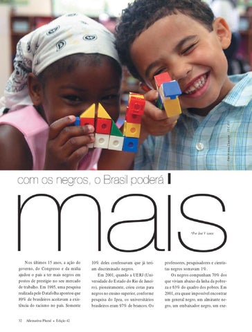professores, pesquisadores e cientistas negros somavam 1%. Os negros compunham 70% dos que viviam abaixo da linha da pobreza e 63% do quadro dos pobres. Em 2001, era quase impossível encontrar um general negro, um almirante negro, um embaixador negro, um exe-
