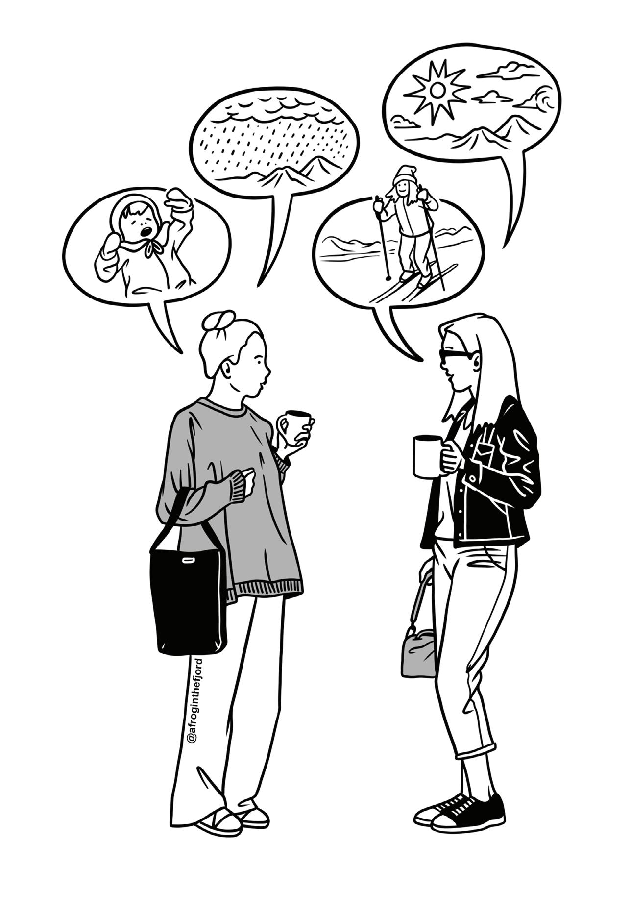 NORWEGIANS OFTEN say they are bad at small talk. That is totally wrong. They engage in small talk all the time and are masters at it, they just don’t realize it. What they dislike are awkward silences and unstructured social situations. Norwegians need clear rules and predictable patterns to socialize, especially when interacting with people outside their intimate or family life. As a result, they have developed a set of safe topics for small talk. These topics can be used with anyone (colleagues, acquaintances, neighbors) to maintain a light and enjoyable conversation. Without revealing much about personal life or opinions, you’ll avoid awkward silences, uncomfortable subjects, or God forbid, disagreements. Here are some tips on how to practice small talk the Norwegian way with “safe” topics, this is as close as one comes to an exhaustive list.