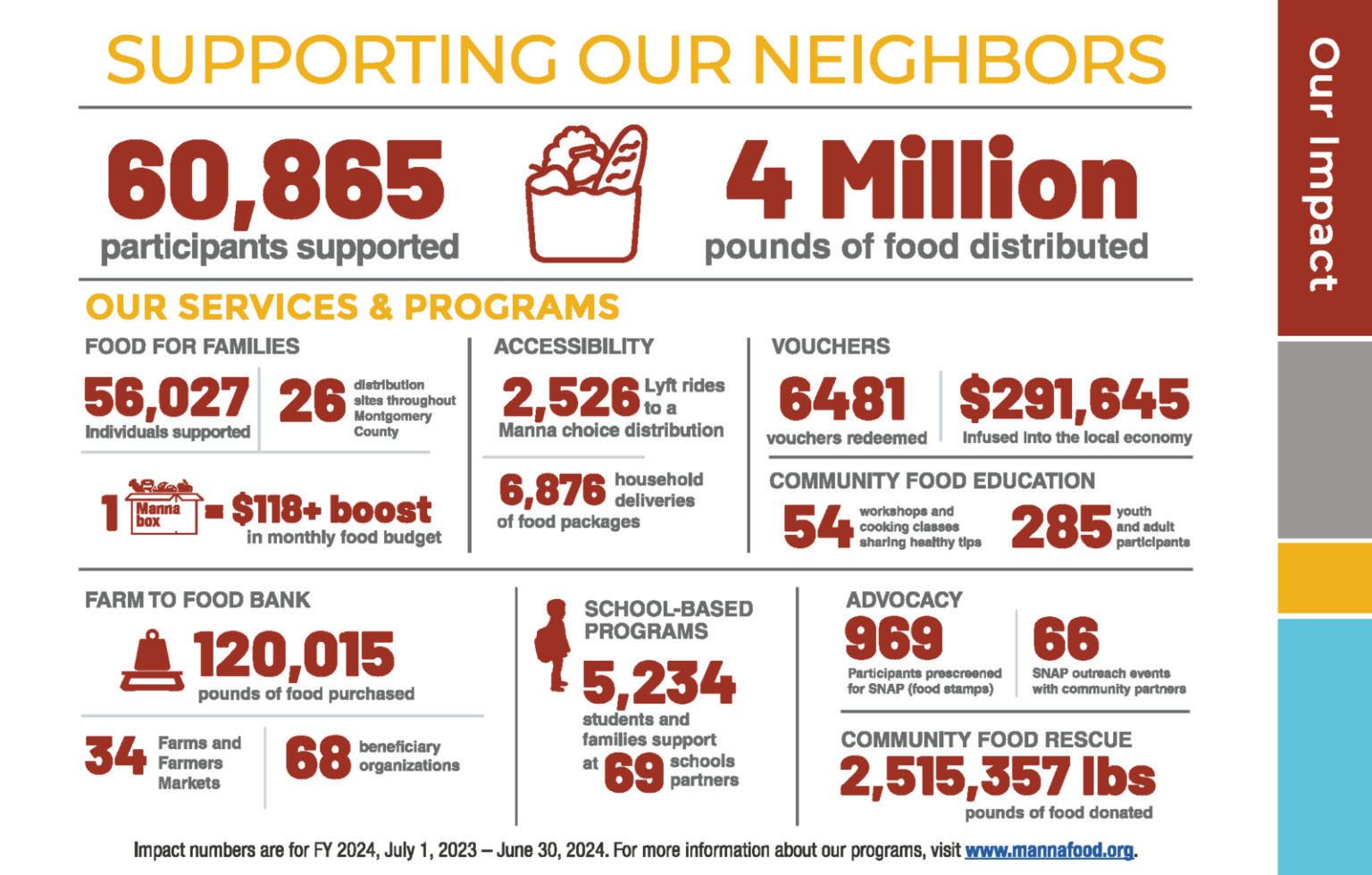 When it first opened its doors in 1983 as a faith-based, centralized food bank, Manna served several hundred clients a month. Today, the organization, which relies on donations and volunteers, distributes more than 12,000 pounds of food daily, offers nutrition education, and in 2024, served 60,865 families.