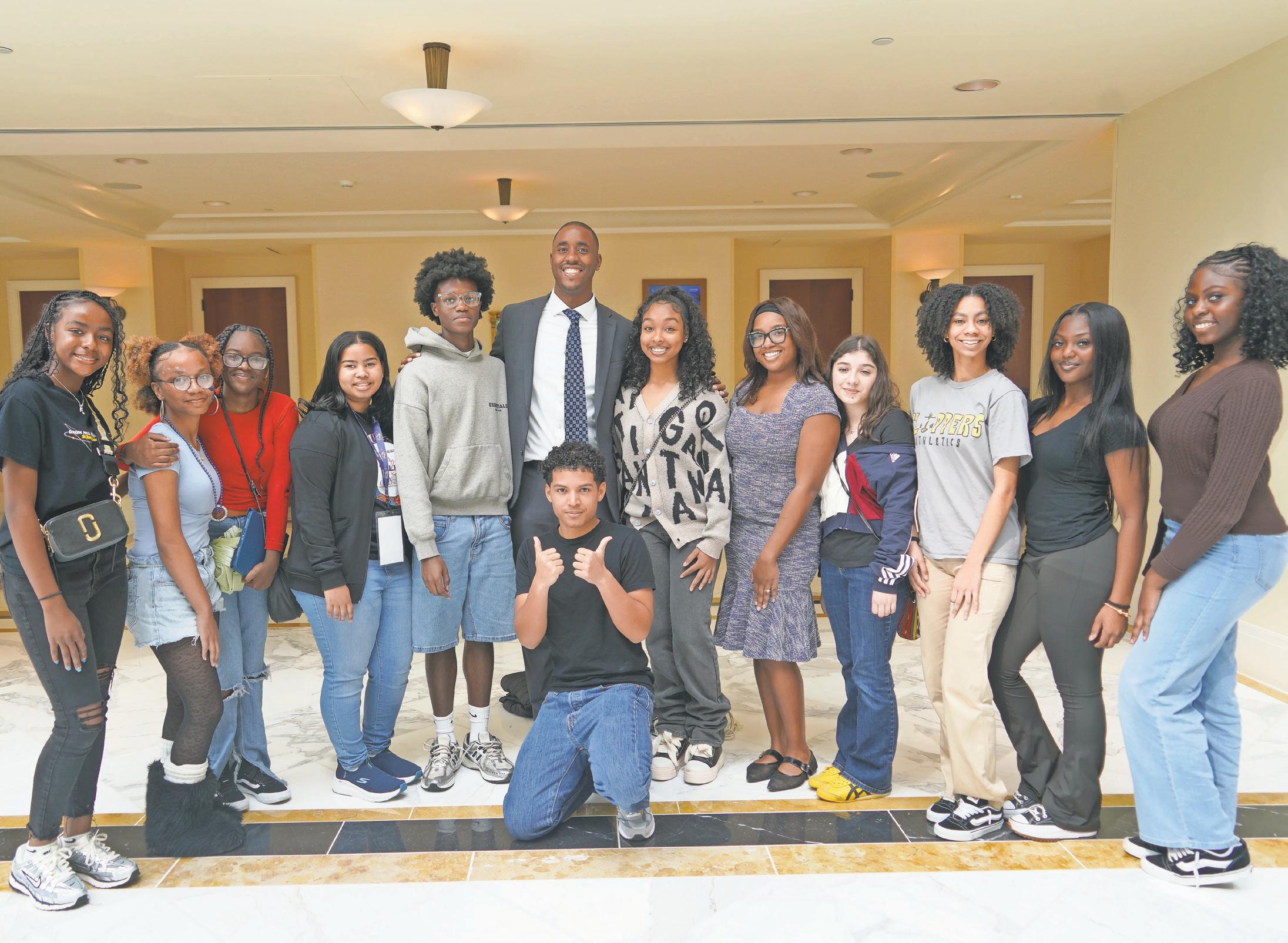 Shown here, Justice Oliver (left), Psalm Fowlkes, Caylen Peeples, Cameena Robinson, Alim Kabia, Prince George’s County Councilman Edward P. Burroughs III (District 8), Angelica Jackson, Brianna Boston, Valeria Hernandez, Sanaa Rodriguez, Nnenna Nwughala, Mariol Musa (back, right) and Williams Scott (front, center) at the Can We Talk? summit.