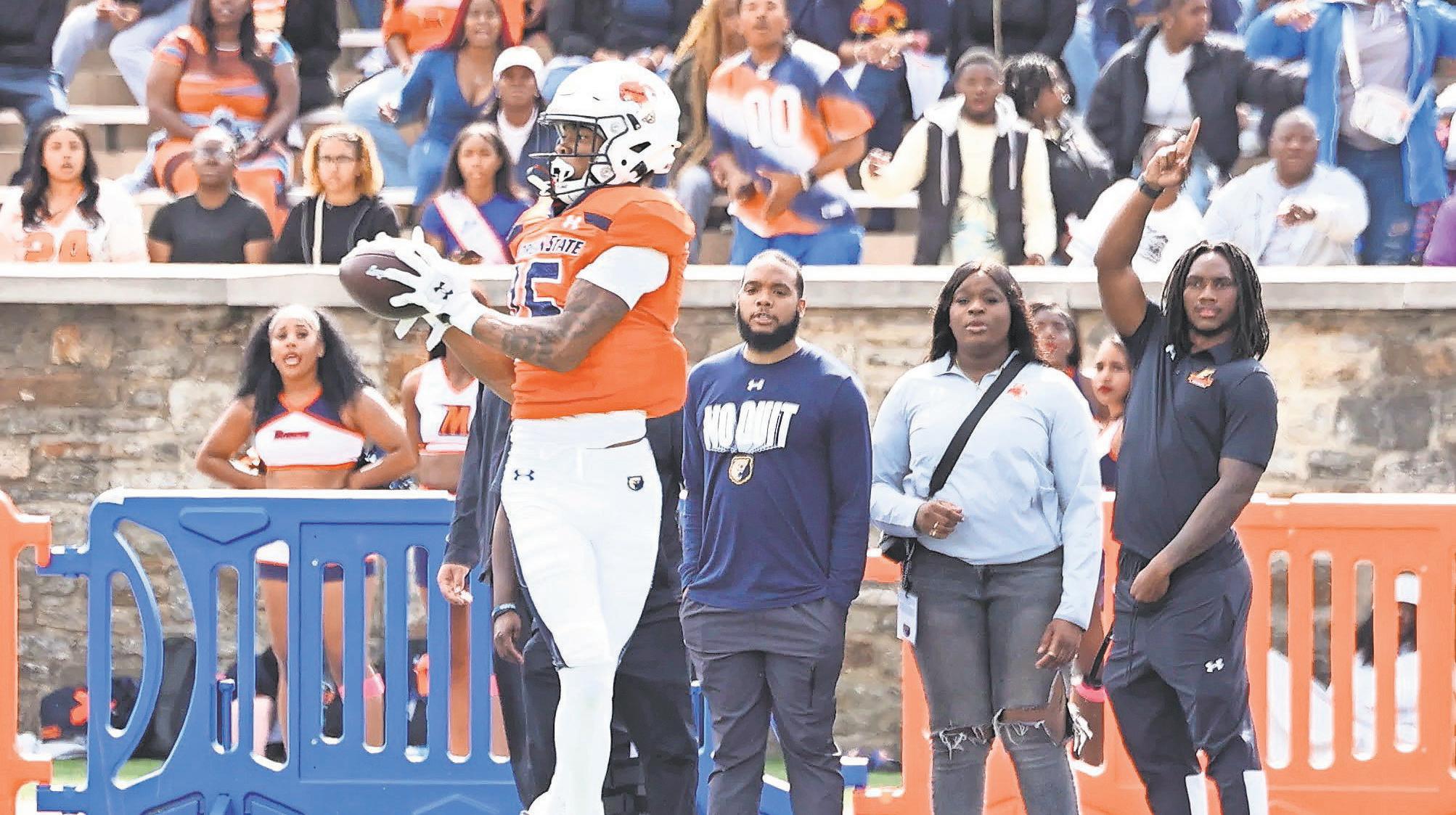 Morgan State University player Justin Perry (#15 ) catches a pass.