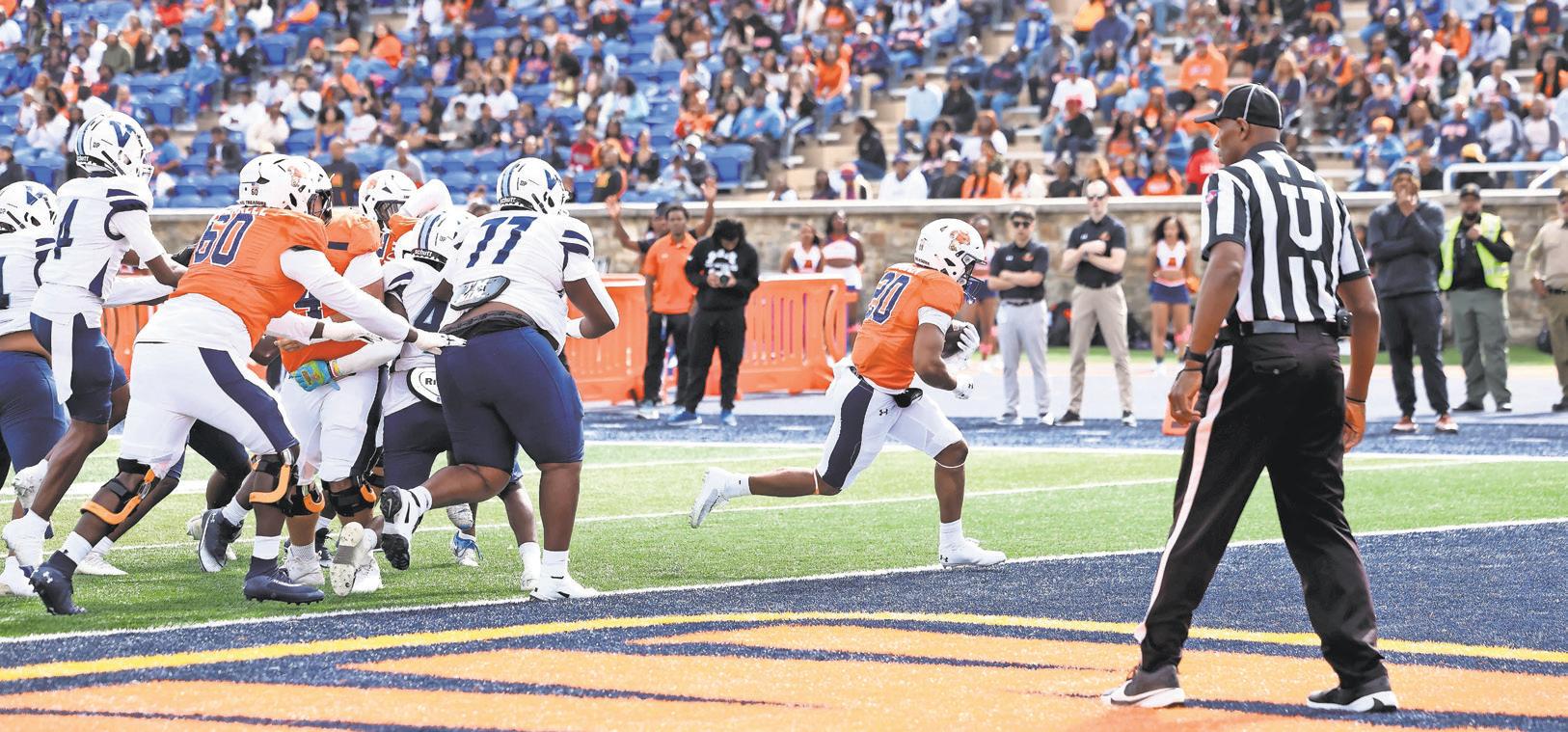 Morgan State University player Randall Nauden (#20) scores a touchdown during the 2025 homecoming game against Virginia University of Lynchburg.