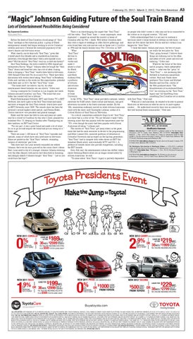 on the verge of maybe perpetrat- ACORN operates. Rather than rely on volunteers, it pays peoing one of the greatest frauds in ple, many of them poor or unemvoter history in this country, ployed, to sign up new voters. maybe destroying the fabric of February 25, 2012 - March 2, 2012, The Afro-American The idea was to help both those democracy.” Factcheck.org, a non-partisan being registered and those doing the registration. Web site, found those claims to Maud explained, “We have a be “exaggerated,” with “no evizero tolerance policy for deliberdence of any such democracyate falsification of registration.” destroying fraud.” Most news account neglect to Hurd believes the McCain charges were politically motivat- point out that ACORN is required by law to committed turn in all regThere is no shortchanging the impact that “Soul Train” on may not be as to ed.people who didn’t create it, who forms. And they also fail said,as“Because it’s lowstill has today. “Soul Train” lines — some impromptu, some the She culture its original creators,”istration Hill said. to note was the organizaandGibbs moderate-income people, organized — popped up around the country in honor of acknowledged that it is not easythat to itcontinue a tion, in many and people of color, I believe the Cornelius after his Feb. 1 death. Well before Cornelius died, television show’s brand beyond its lifetime on instances, televisionthat —first and brought the phony registrations McCain campaign thinks those they were a staple at weddings or other festive gatherings, and there are few shows that have. But he said he’s certain it can to the attention of authorities. voters are to Train.” vote even found their way into movies such as Spike Lee’s Crooklyn happen forgoing “Soul The McCain camp apparently Democratic, which is not necesin 1994 and the family holiday story This Christmas in 2007. “I think that dance, fashion and music, the best of music, isn’t interested in those fine sarily true.” “What are really the tent poles for ‘Soul points, preferring to air misleadACORN is no stranger to ‘Soul Train’ Train’ going forward. I believe those ing ads that seek to link Obama controversy. did was to things aretoenduring as the ideas ACORN,just thereby undercutting For 38 years, the non-partisan make it so and ideals of love, peace and soul are organization has fought for social his political support. visible and enduring,” Gibbs said. McCain: I’m John McCain and economic justice for lowmake it Whatever futurethis of message. the show and Ithe approve and moderate-income almost a ritual and its progeny, black independent Announcer: Who is Barack Americans. With 400,000 memfor Black what was the “germ” of A man with “a political ber families organized intomedia more —Obama? baptism performed at warp America,” “Soul Train” — are increasing their than 1,200 neighborhood chapspeed.” Vast ambition. After colters in 110 cities nationwide, said Mark foothold in American mainstream lege, said. he moved to show Chicago. ACORN has over the yearsculture, seen Neal Anthony Neal, Radio a community organizer. its share of criticism while producers advo- Became a professor Tom Joyner and Michael There, Obama met Madeleine cating for affordable housing, of African Baisden and Issa Rae, creator of Talbot, partshow of the“The Chicago living wages, healthcare forthe theWeb-produced and Africanbranch of ACORN. He was so underserved— and while organAmerican Misadventures of an Awkward Black impressive that he was asked to izing voter registration drives. Studies Girl” are carrying on the “Soul Train” train the ACORN staff. But none has been asTMwithering at Duke legacy and “all from Whatbenefitting did ACORN in Chicago and baseless as this one. University. something Don Cornelius set in motion engage in? Bullying banks. With the presidential election In the 1970s, “Soul Train” alone provided a national, weekly with Soul Train,” Neal said. Intimidation tactics. Disruption less than two weeks away, showcase for R&B artists, black culture and fashion, and gave “When detractors all is saidallege and done, to be able to present business. ACORN forced ACORN’s the he ofwanted advertisers an entrée to the black consumer market. By the black acts onhas television what hebanks saw to asissue its most riskyorganic home loans. organization engaged on in mas‘80s, mainstream audiences moved on while African Americans context ....registration He understood correctly there anofinterest for The samewas types loans that sive voter fraud after stuck with the show, said Christopher Lehman, author of A that well beyond black Neal caused the said. financial crisis we’re the reported discovery of communities,” bogus in today. names, such as Mickey Mouse Critical History of Soul Train on Television. “As a result, mainstream audiences begin to see ‘Soul Train’ as a show that is a relic of the ‘70s just because it hadn’t been showing music that was popular with the mainstream since the ‘70’s, even though the music had been popular with African Americans all along,” Lehman said. Identification Statements The success of “Soul Train” got many others in the game, Baltimore Afro-American — (USPS 040-800) is published weekly by The Afro-American some that had far more resources to devote to the programming, Newspapers, 2519 N. Charles Street, Baltimore, MD 21218-4602. Subscription Rate: said Marc Lamont Hill, associate professor of education at Baltimore - 1 Year - $30.00 (Price includes tax.) Checks for subscriptions should be made payable to: The Afro-American Newspaper Company, 2519 N. Charles Street, Baltimore, MD Columbia University and an expert on the hip-hop generation. 21218-4602. Periodicals postage paid at Baltimore, MD. “Soul Train” had to compete with video shows on BET that POSTMASTER: Send addresses changes to: The Afro-American Newspaper Com