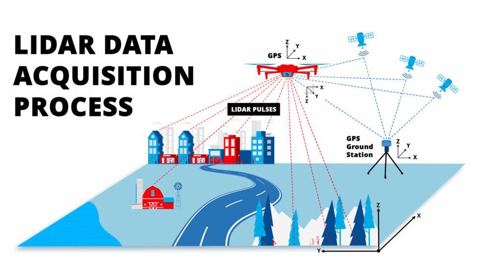 LiDAR Scanning: A high-frequency laser sensor emits pulses and measures their return time for precise elevation mapping.