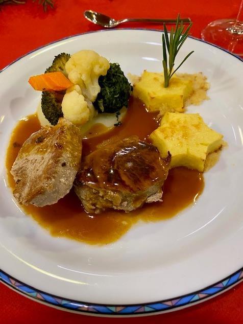Aargauer Schweinebraten an Zwetschgensauce, Kartoffelgratin, grüne Bohnen, Zwiebeln